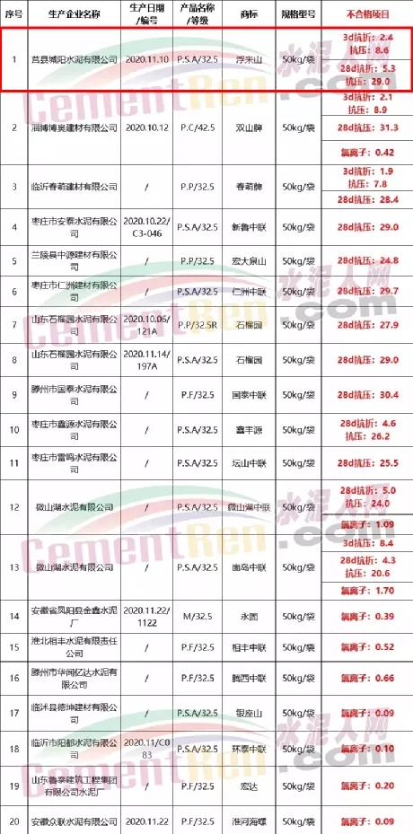 涉及產(chǎn)品為礦渣硅酸鹽水泥P.S.A 42.5、P.S.B 32.5和普通硅酸鹽水泥P.O 42.5,不合格項(xiàng)目為氯離子、水溶性鉻(Ⅵ)、抗壓強(qiáng)度、抗折強(qiáng)度等。