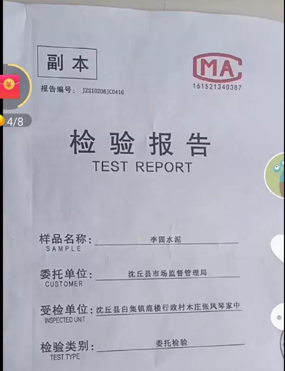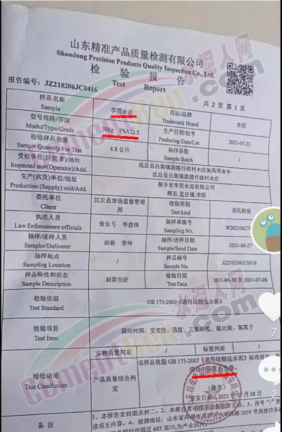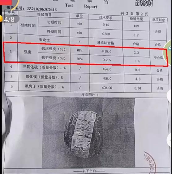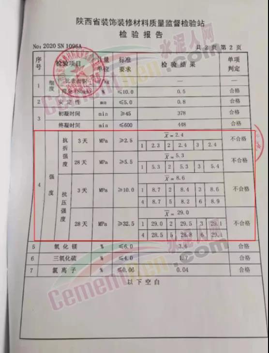 經(jīng)檢測,共檢出不合格水泥20批次,不合格率高達(dá)23.5%。其中抗壓、抗折強(qiáng)度不合格13個(gè)批次,氯離子含量超標(biāo)不合格10個(gè)批次。在檢出的不合格水泥中,部分批次28天抗折強(qiáng)度僅為4.3MPa;28天抗壓強(qiáng)度也只有20.6MPa;氯離子達(dá)到了1.70,超出國家標(biāo)準(zhǔn)28倍。以莒縣城陽水泥有限公司P.S.A32.5水泥為例,抽檢結(jié)果顯示3天強(qiáng)度、28天強(qiáng)度均不達(dá)標(biāo)。