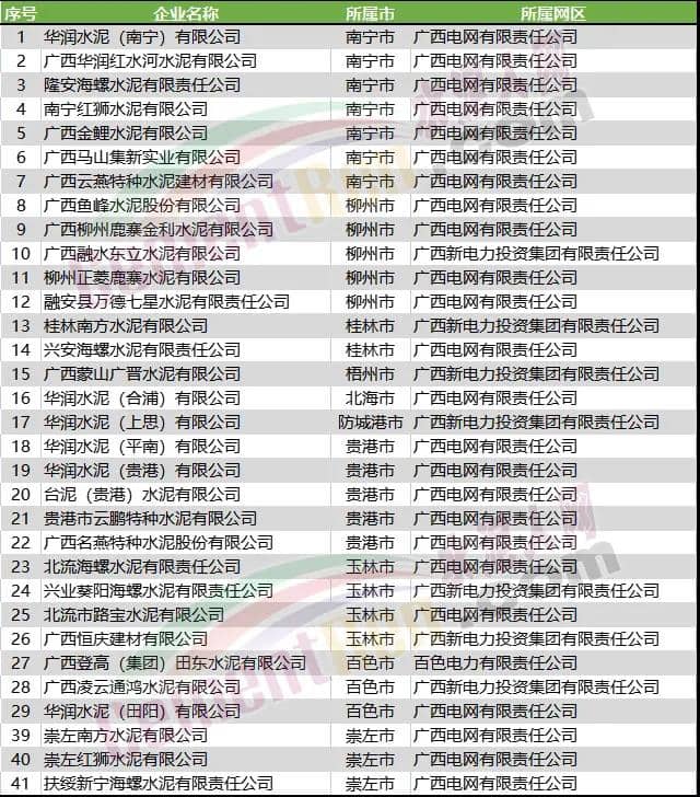9月份用電負荷,不超過上半年的平均月負荷的40%。涉及的水泥企業(yè)包括華潤水泥、海螺水泥、南方水泥、紅獅水泥、魚峰水泥、虎鷹水泥、東泥天等、融水東立建材等共41家。
