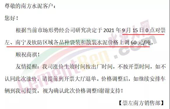 崇左南方銷售部通知9月15日0點起對崇左、南寧及欽防區(qū)域各品種袋裝和散裝水泥價格上調60元/噸。