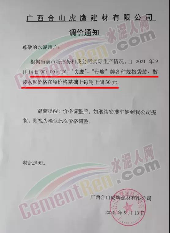 廣西合山虎鷹建材通知,根據(jù)當前市場形勢和公司實際生產(chǎn)情況,自9月14日0時起“尖鷹”、“丹鷹”牌各規(guī)格袋裝、散裝水泥上調30元/噸。