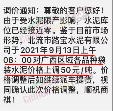 北流寶路水泥通知,由于受水泥限產(chǎn)影響,水泥庫位已經(jīng)接近零。鑒于目前市場形勢,北流市路寶水泥有限公司于2021年9月13日上午8時對廣西區(qū)域各品種袋裝水泥價格上調50元/噸。本月內(nèi)北流寶路水泥曾連發(fā)多函上調廣西及廣東區(qū)域水泥報價,三輪累計上調150-160元/噸。