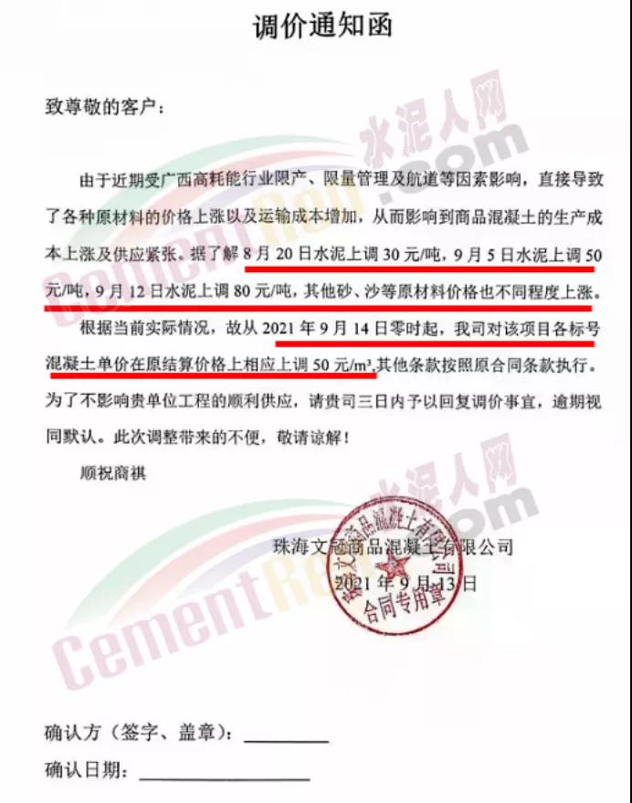 廣東珠海文冠商品混凝土公司通知稱,由于近期受廣西高耗能行業(yè)限產(chǎn)、限量管理及航道等因素影響,直接導致了各種原材料的價格上漲以及運輸成本增加,從而影響到商品混凝土的生產(chǎn)成本上漲及供應緊張。