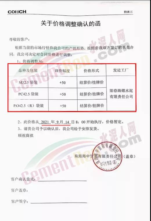 珠海海中貿(mào)易有限責任公司通知,9月14日起,自陽春海螺水泥發(fā)運的各等級袋裝水泥上調50元/噸。
