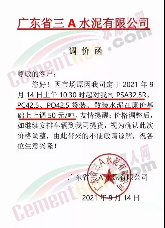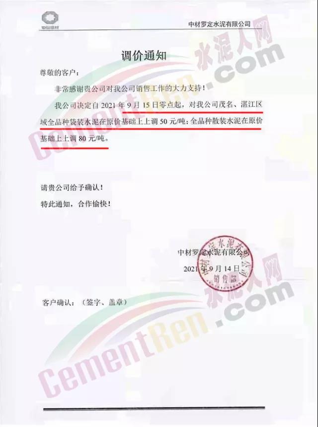 中材羅定水泥有限公司通知,自9月15日0點起,公司對茂名、湛江區(qū)域全品種袋裝水泥在原價基礎上上調50元/噸,全品種散裝水泥在原價基礎上上調80元/噸。
