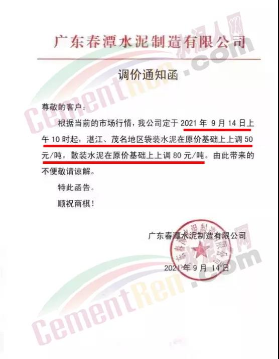廣東春潭水泥制造有限公司通知9月14日上午10時起,湛江、茂名地區(qū)袋裝水泥上調50元/噸,散裝水泥上調80元/噸。