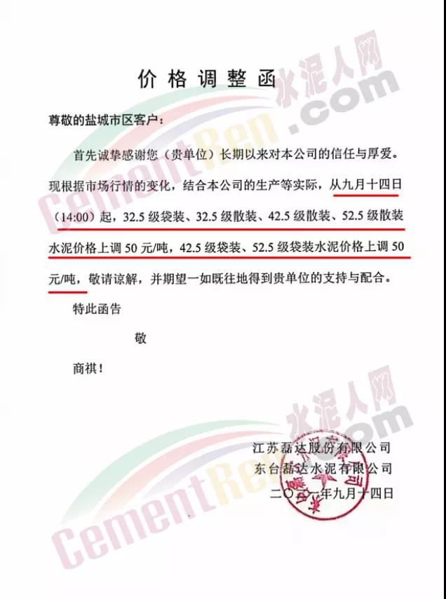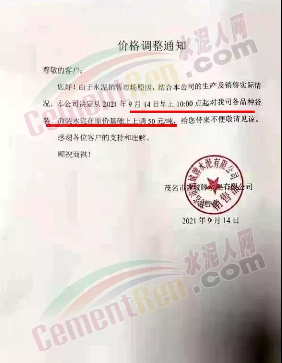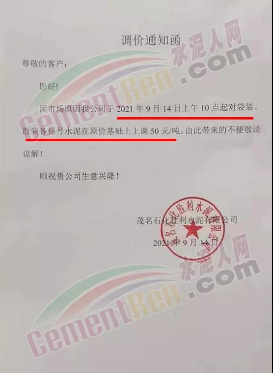 廣東茂名石化勝利水泥有限公司通知,自9月14日上午10點起對袋裝、散裝各標號水泥在原價基礎上上調50元/噸。