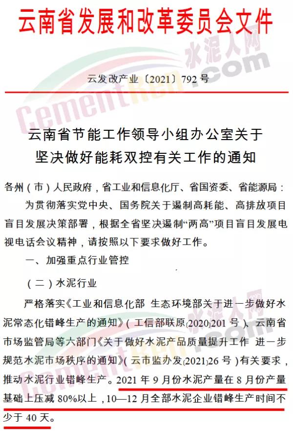 日前,云南省發(fā)改委發(fā)文要求9月份水泥產(chǎn)量在8月份產(chǎn)量基礎上壓減80%以上,10-12月全部水泥企業(yè)錯峰生產(chǎn)時間不少于40天。