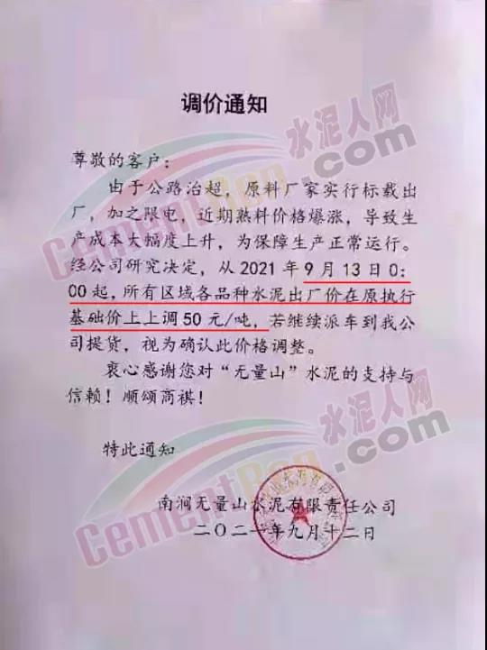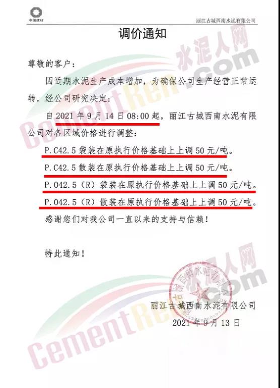 麗江古城西南水泥有限公司通知,自9月14日8時起,公司各標號水泥上調50元/噸。