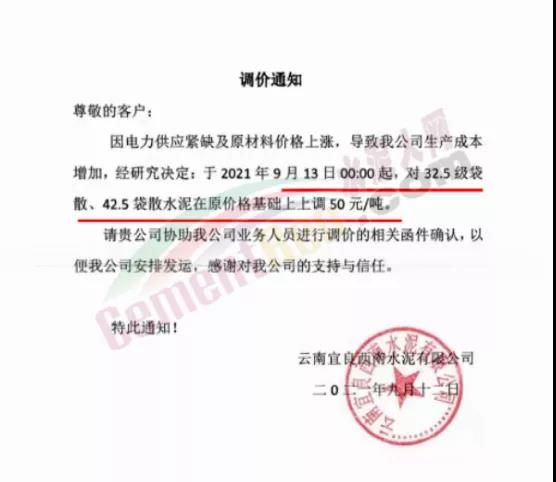云南昆鋼嘉華水泥建材有限公司通知受近期原燃材料價格上漲及國家能耗雙控政策影響,水泥生產(chǎn)成本大幅上升,為保證正常生產(chǎn)經(jīng)營,于9月13日起,各品種散裝水泥價格上調50元/噸。