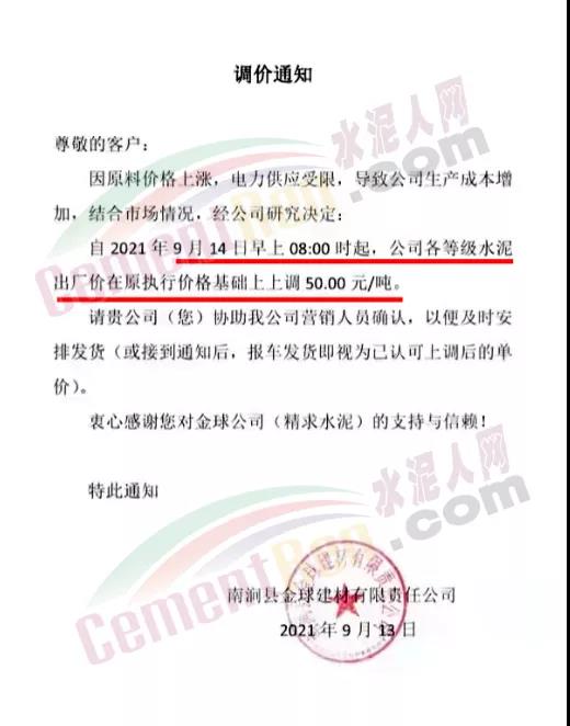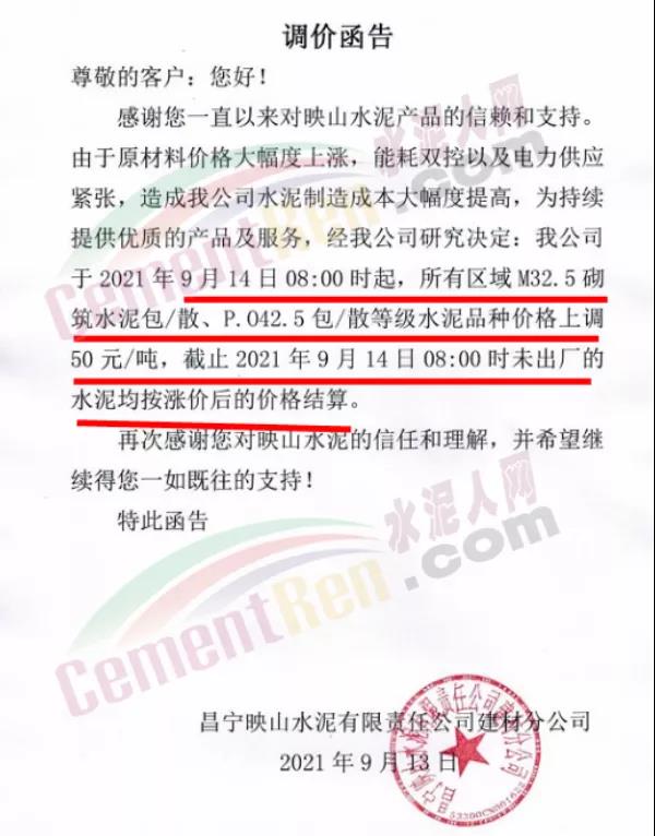 大理白族自治州南澗彝族自治縣金球建材有限公司通知,因原料價格上漲,電力供應受限,導致公司生產(chǎn)成本增加,結合市場情況,經(jīng)公司研究決定,自9月14日早上8時起,公司各等級水泥出廠價上調50元/噸。
