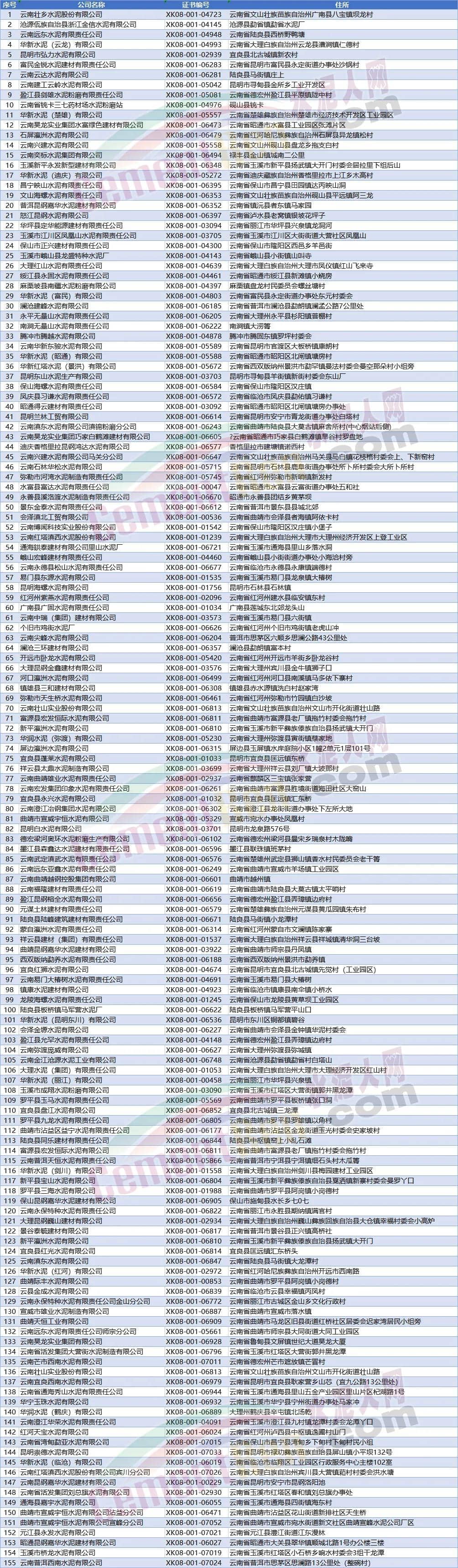 市場監(jiān)管總局工業(yè)品生產(chǎn)許可證辦公室數(shù)據(jù)顯示,包括云南155家,廣西41家水泥企業(yè)在內(nèi),能耗不降反升的9個地區(qū)共有水泥企業(yè)近千家。這近千家水泥企業(yè)或將在這個旺季遭遇成本上漲,無水泥可賣,限量供應,業(yè)績下滑等窘境。部分水泥企業(yè)名單如下: