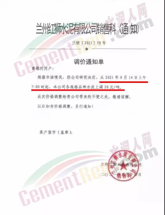 蘭州紅獅水泥通知9月14日上午7時起,水泥價格上調20元/噸。