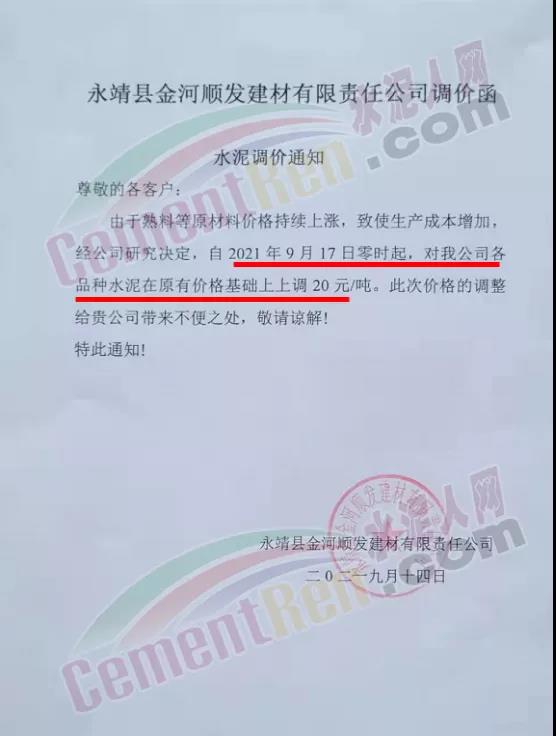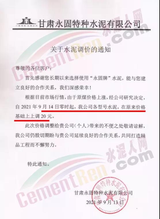 甘肅永固特種水泥通知9月14日0時起,水泥價格上調20元/噸。