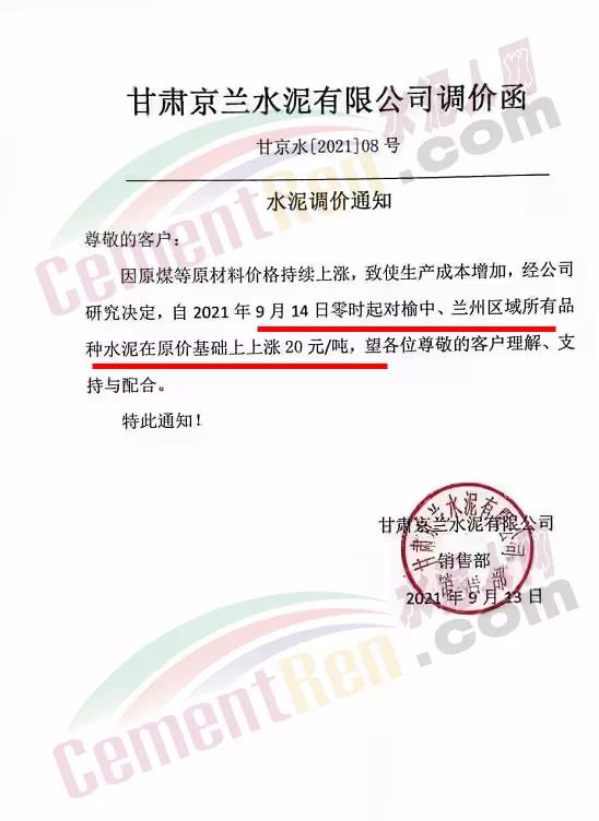 甘肅京蘭水泥通知9月14日0時起對榆中、蘭州區(qū)域所有品種水泥上調20元/噸。