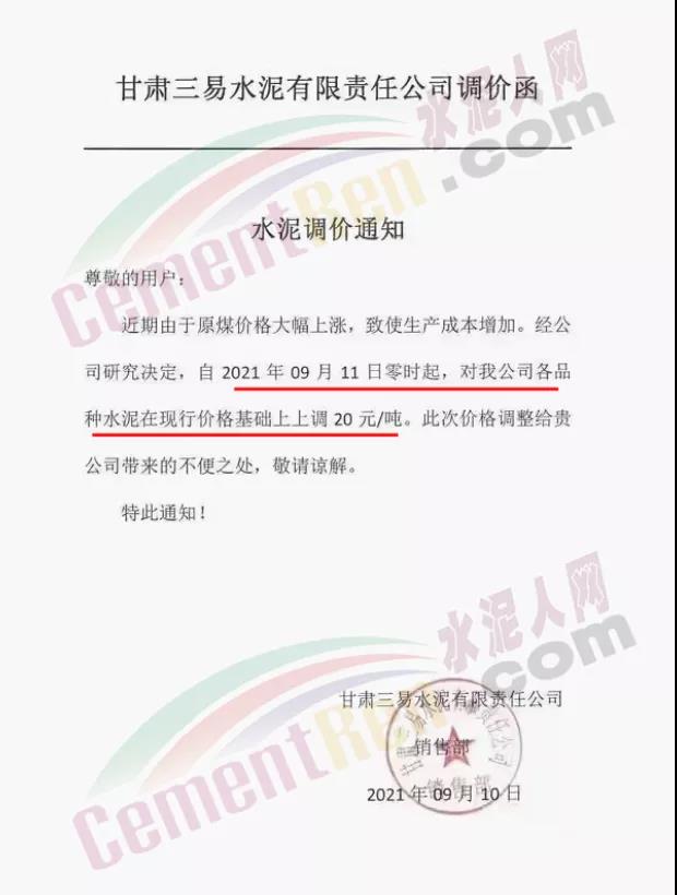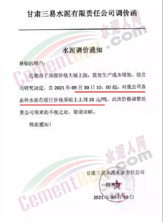 甘肅三易水泥有限公司9月10日連發(fā)兩份調價函,分別于9月10日10時起,于9月11日0時兩次上調各品水泥價格20元/噸,累計漲價40元/噸。