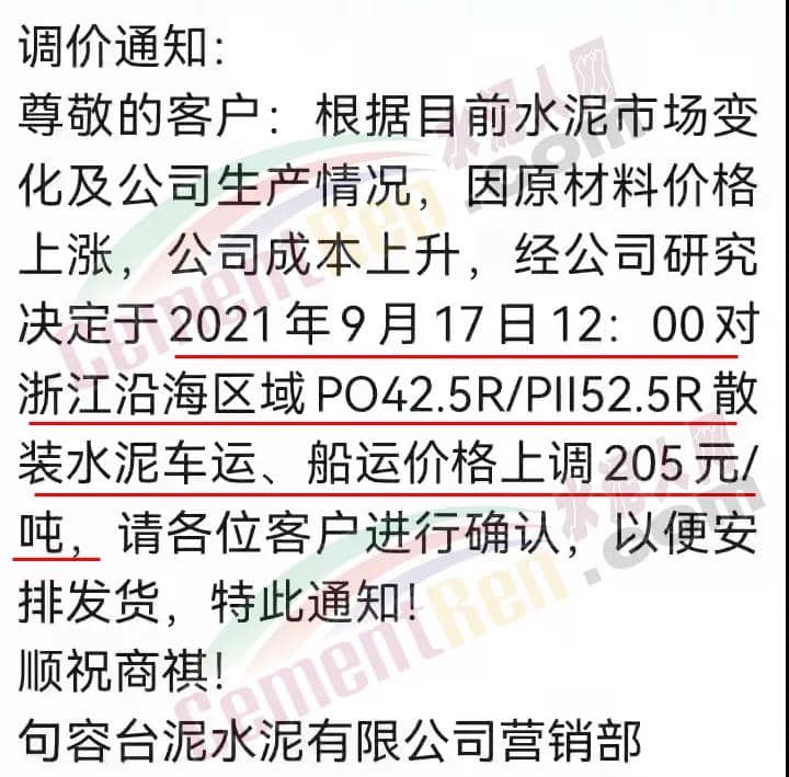 句容臺泥水泥有限公司通知稱,根據目前水泥市場變化及公司生產情況,因原材料價格上漲,公司成本上升,經公司研究決定于2021年9月17日12時對浙江沿海區域PO42.5R/PII52.5R散裝水泥車運、船運價格上調205元/噸,創造了近年來單次漲價最高紀錄。