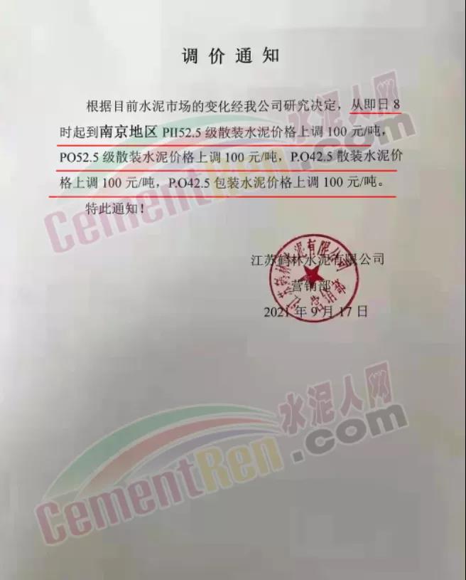 江蘇鶴林水泥有限公司通知,從17日8時起南京地區各標號水泥上調100元/噸。