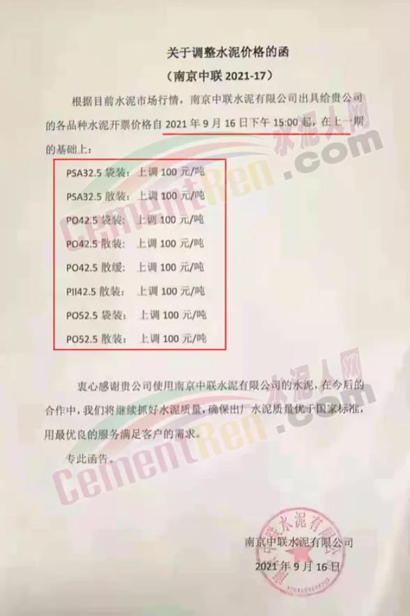 南京中聯水泥有限公司通知,根據目前水泥市場行情,自9月16日下午15時起各標號水泥上調100元/噸。