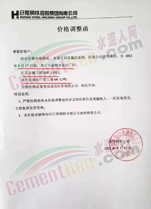 日照鋼鐵控股集團通知,自9月17日起公司蒙陰水泥出廠價,江蘇區域上調105元/噸,其他區域出廠價上調60元/噸。