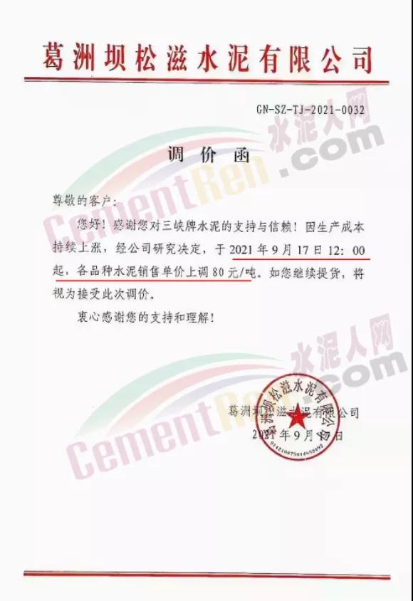 葛洲壩松滋水泥有限公司通知因生產成本持續上漲,于9月17日12時上調各標號水泥價格80元/噸。