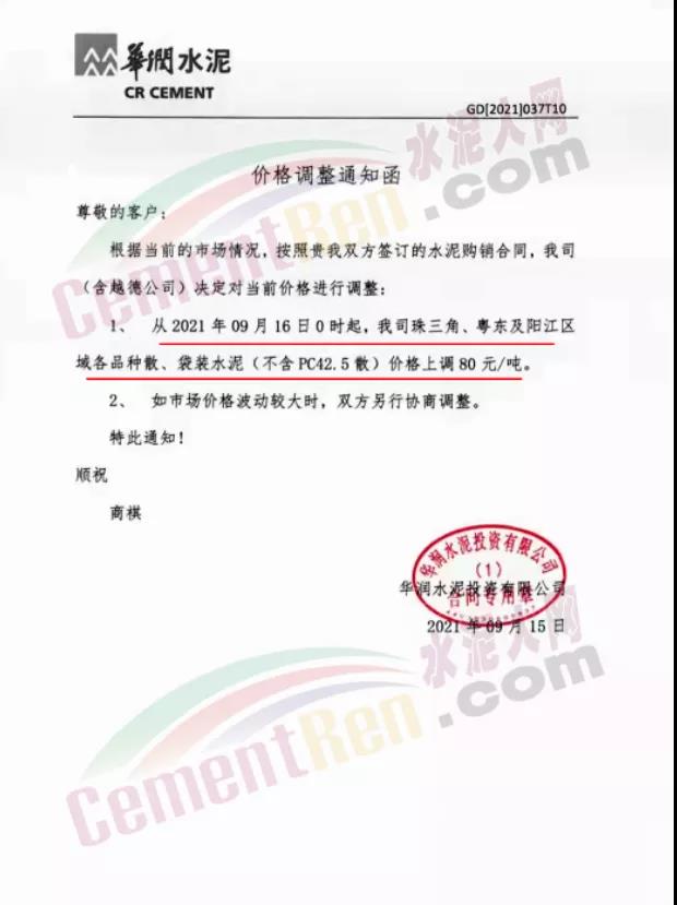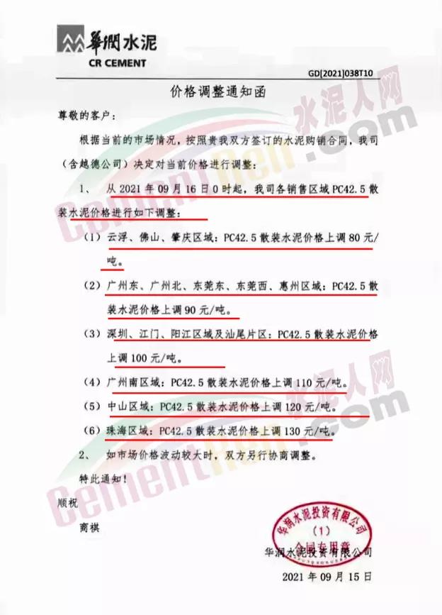 華潤水泥通知,根據當前的市場情況,公司(含越德公司)從2021年9月16日0時起,珠三角、粵東及陽江區域各品種散、袋裝水泥(不含PC42.5散)價格上調 80元/噸。