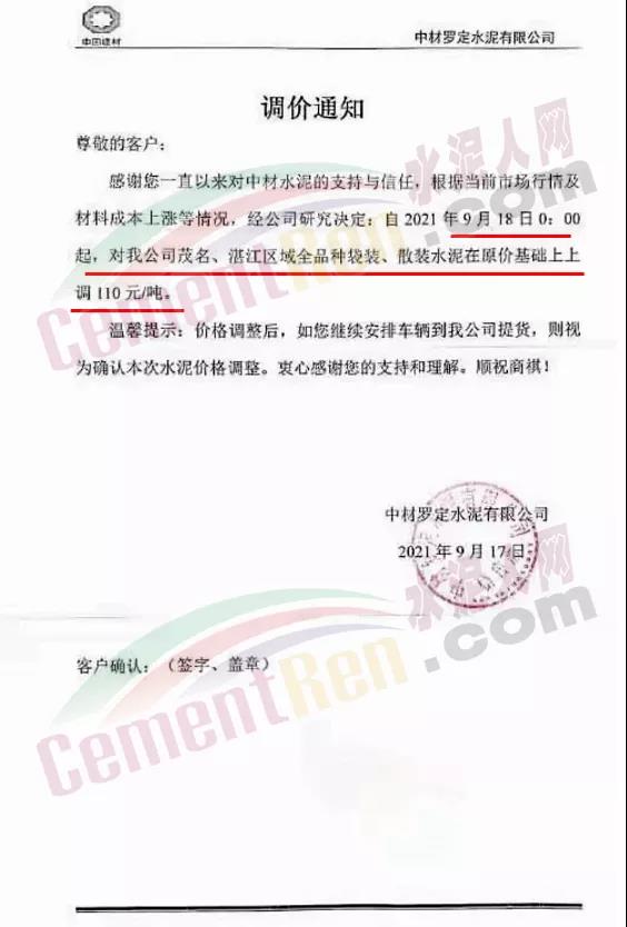 茂名市油城牌水泥有限公司通知,于9月17日12時起上調水泥價格110元/噸。