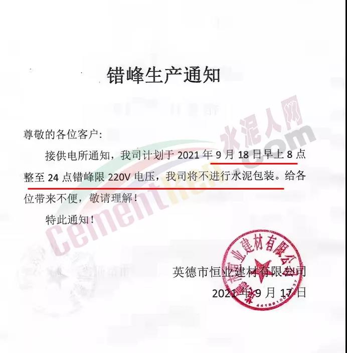 英德市恒業建材有限公司通知,9月18日早8點至24電錯峰限220V電壓,公司將不進行水泥包裝。