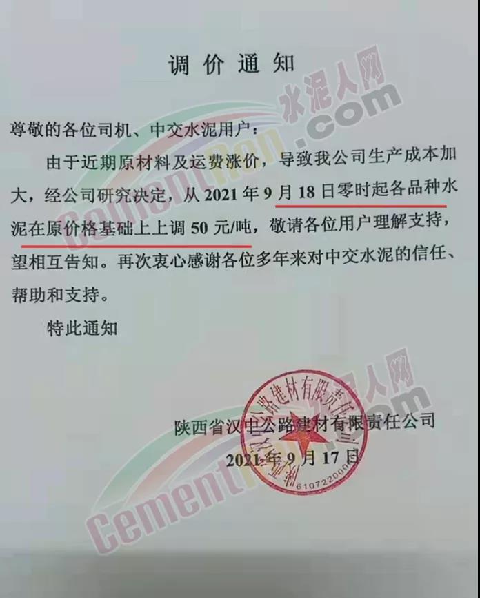 陜西省漢中公路建材有限責任公司通知,9月18日零時起各品種水泥上調50元/噸。