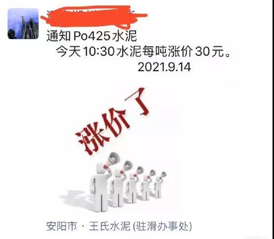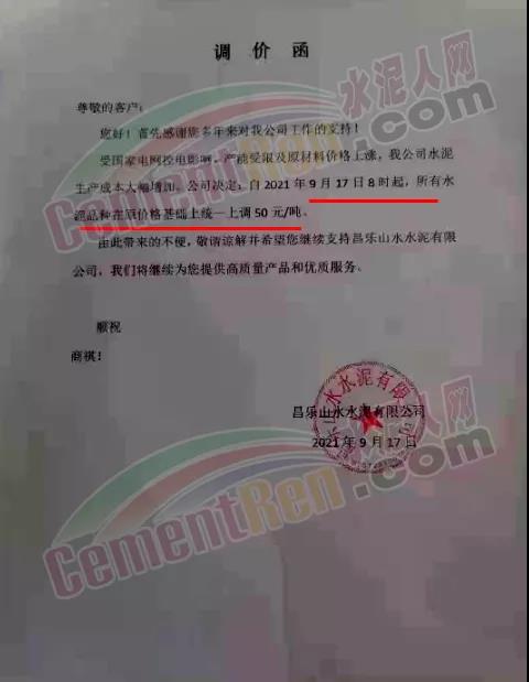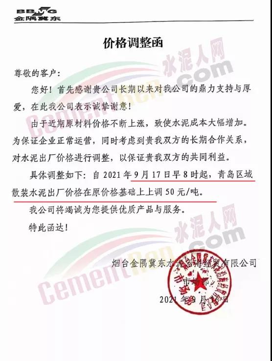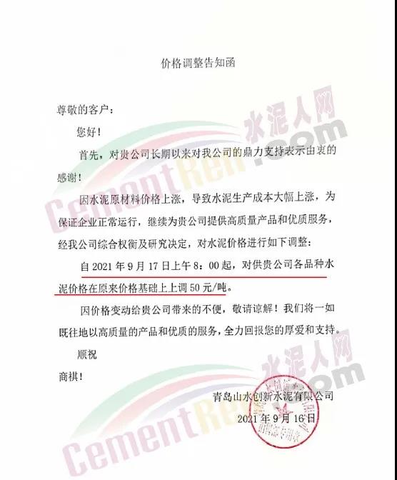 青島即墨中聯水泥有限公司通知,由于近期原材料價格上漲,致使水泥成本大幅增加,為保證企業正常運營,自2021年9月17日8時起,公司生產的各品種水泥在原有價格基礎上上調50元/噸。