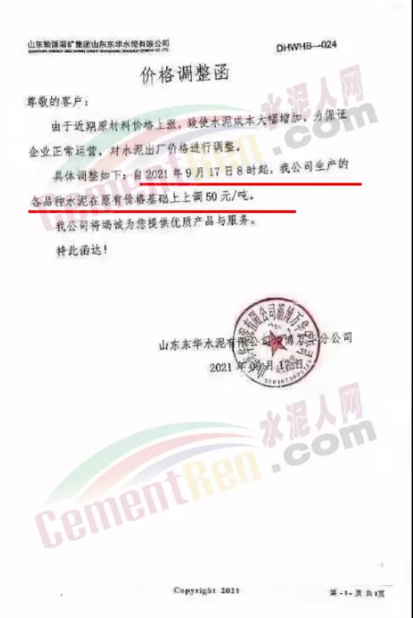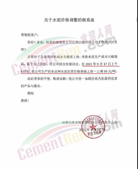 山東山水水泥集團有限公司青島分公司通知由于各類原材料成本大幅度上漲,導致水泥生產成本大幅提高。鑒于以上原因,經公司綜合權衡決定自2021年9月17日上午8時起,公司生產的各品種水泥在原價格基礎上統一上調50元/噸。