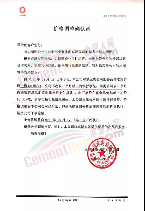 中聯水泥淮海運營區曲阜中聯水泥有限公司通知根據市場實際情況,為保證企業良性運營,自9月17日早8點各品種水泥價格上調50元/噸。公司不收取6個月以上的銀行承兌,如貴公司以6個月內的銀行承兌匯票向我公司支付貨款,出廠單價在現金單價基礎上加價10元/噸,另受市場實際情況影響,本公司水泥價格隨市場行情調整,價格調整后本公司會對已付款、但尚未提貨部分貨款按調整后的價格執行。