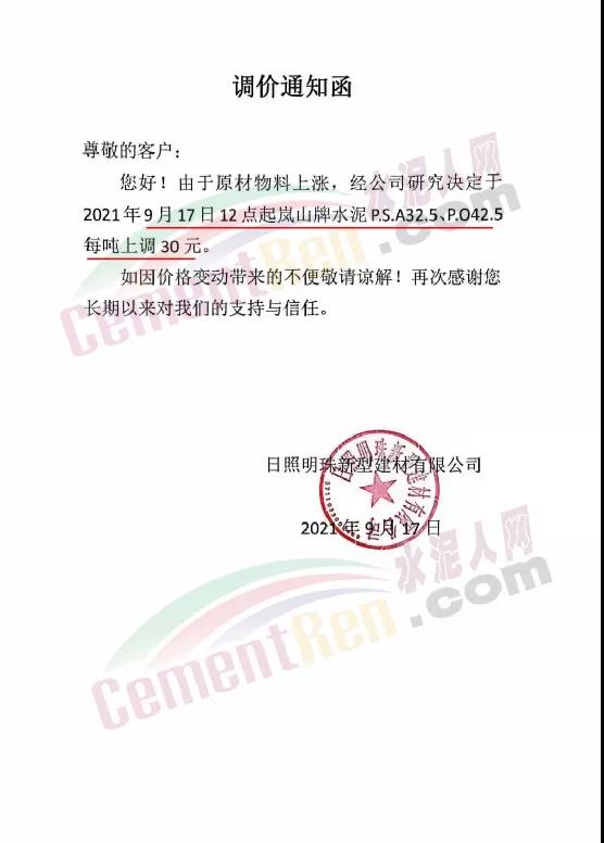日照明珠新型建材有限公司通知,由于原材物料上漲,經公司研究決定于2021年9月17日12點起嵐山牌水泥PS.A32.5、P.O42.5每噸上調30元。