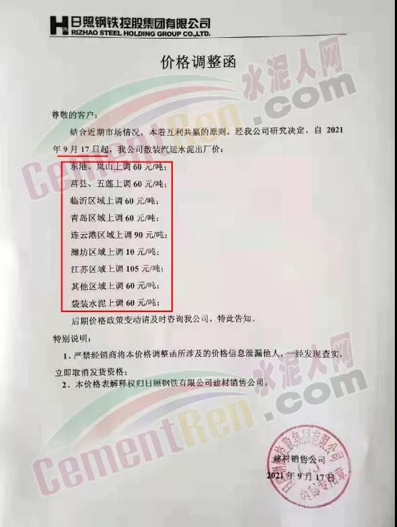 日照鋼鐵控股集團有限公司建材銷售公司通知,結合近期市場情況,本著互利共贏的原則,經公司研究決定,自2021年9月17日起,公司散裝汽運水泥出廠價東港、嵐山上調60元/噸;莒縣、五蓮上調60元/噸∶臨沂區域上調60元/噸;青島區域上調60元/噸;連云港區域上調90元/噸∶濰坊區域上調10元/噸;江蘇區域上調105元/噸∶其他區域上調60元/噸;袋裝水泥上調60元/噸。