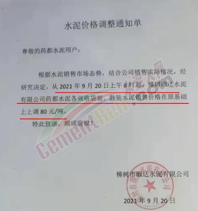 9月20日,江西地區(qū)樟樹市順達(dá)水泥有限公司發(fā)布通知稱:根據(jù)水泥銷售市場(chǎng)態(tài)勢(shì),結(jié)合公司銷售實(shí)際情況,經(jīng)研究決定,自2021年9月20日上午8時(shí)起,樟樹順達(dá)水泥有限公司藥都水泥各規(guī)格袋裝、散裝水泥銷售價(jià)格在原基礎(chǔ)上上調(diào)80元/噸。