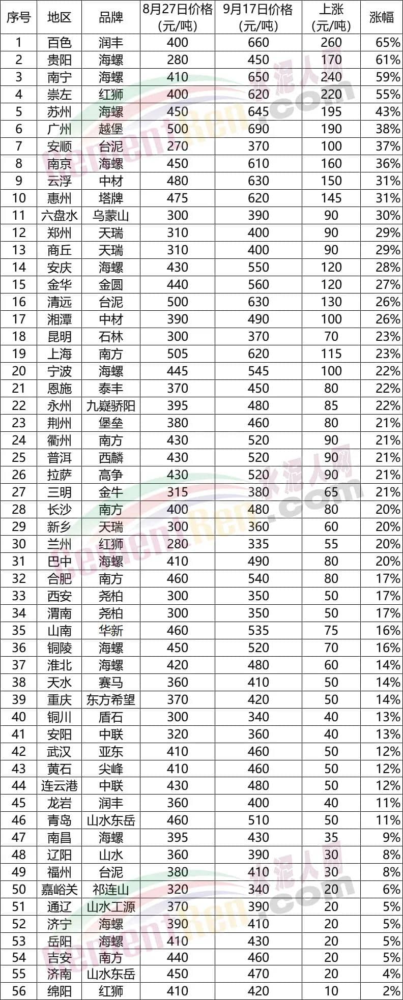 全國56個(gè)地區(qū)PO42.5散裝水泥價(jià)格漲幅榜