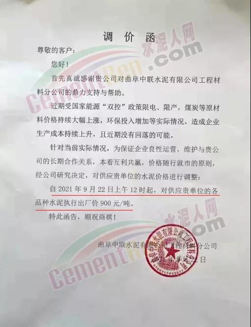 近日,曲阜中聯(lián)水泥有限公司工程材料分公司通知,近期受國家能源“雙控”政策限電、限產(chǎn),煤炭等原材料價(jià)格持續(xù)大幅上漲,環(huán)保投入增加等實(shí)際情況,造成企業(yè)生產(chǎn)成本持續(xù)上升,且近期沒有回落的可能。針對(duì)當(dāng)前實(shí)際情況,為保證企業(yè)良性運(yùn)營,經(jīng)公司研究決定,自2021年9月22日上午12時(shí)起,各品種水泥執(zhí)行出廠價(jià)900元/噸。
