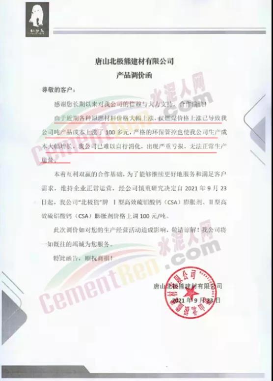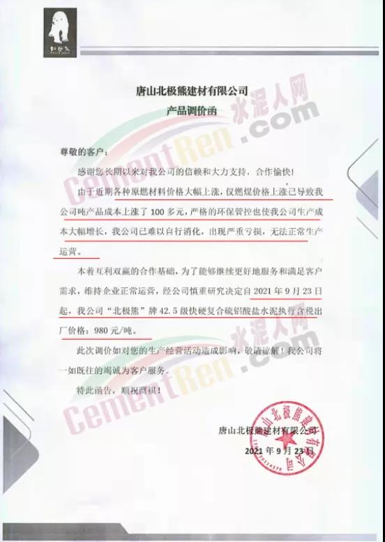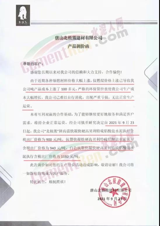 特種水泥方面,不僅山東區(qū)域,河北區(qū)域也有多家特種水泥企業(yè)上調(diào)水泥價(jià)格。唐山北極熊建材有限公司連發(fā)三份產(chǎn)品調(diào)價(jià)函稱,由于近期各種原燃材料價(jià)格大幅上漲,僅燃煤價(jià)格上漲已導(dǎo)致公司噸產(chǎn)品成本上漲了100多元,為了能夠維續(xù)更好地服務(wù)和滿足客戶需求,維持企業(yè)正常運(yùn)營。