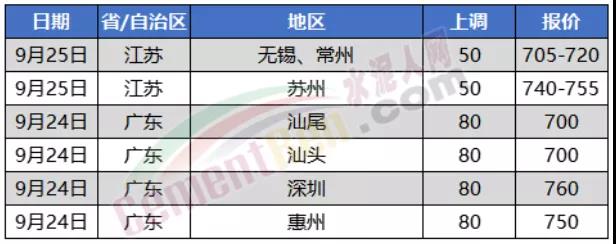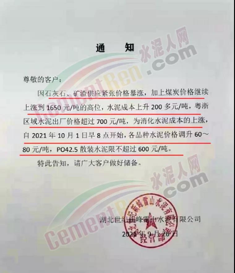 日前,湖北世紀新峰雷山水泥通知稱,因石灰石、礦渣供應緊張價格暴漲,加上煤炭價格繼續上漲到1650元/噸的高位,水泥成本上升200多元/噸,粵浙區域水泥出廠價格超過700元/噸。為消化水泥成本的上漲,自2021年10月1日早8點開始,各品種水泥價格調升60~80元/噸,PO42.5散裝水泥限不超過600元/噸。