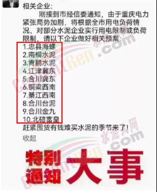 最近一則通知消息,在重慶地區水泥行業里熱傳,水泥銷售紛紛提示客戶趕緊囤貨有錢難買水泥的季節來了。消息稱:剛接到市經信委通知,由于重慶電力緊張局勢加劇,將根據全市用電負荷情況,對部分水泥企業實行用電限制或負荷限制,涉及忠縣海螺、南桐水泥、青鵬水泥、江津冀東、合川冀東、銅梁西南、綦江西南、合川臺泥、合川金九、北碎富皇10家水泥企業。