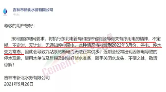 吉林市新北水務有限公司2021年9月26日發布公告稱,按照國家電網要求,將執行東北電管局和吉林省能源局有關有序用電的精神,不定期、不定時、無計劃、無通知停電限電,此種情況將持續到2022年3月份,停電、停水變為常態,因此會導致九站泵站斷電而無法正常供水,近期會經常出現因停電導致的停水現象,望用水單位及居民及時做好儲水準備,隨手關閉水龍頭,不便之處,敬請諒解!