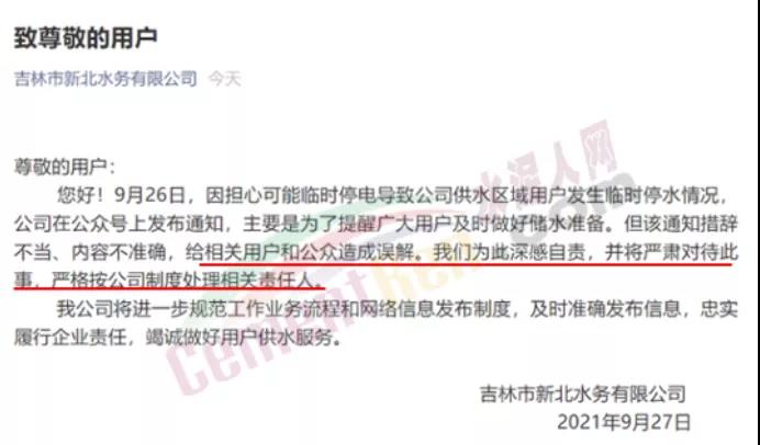 據了解目前該公司已經刪除上述通知。并于9月27日,吉林市新北水務有限公司在其微信公眾號發布公告:9月26日,因擔心可能臨時停電導致公司供水區域用戶發生臨時停水情況稱,公司在公眾號上發布通知,主要是為了提醒廣大用戶及時做好儲水準備。但該通知措辭不當、內容不準確,給相關用戶和公眾造成誤解。我們為此深感自責,并將嚴肅對待此事,嚴格按公司制度處理相關責任人。公司將進一步規范工作業務流程和網絡信息發布制度,及時準確發布信息,忠實履行企業責任,竭誠做好用戶供水服務。