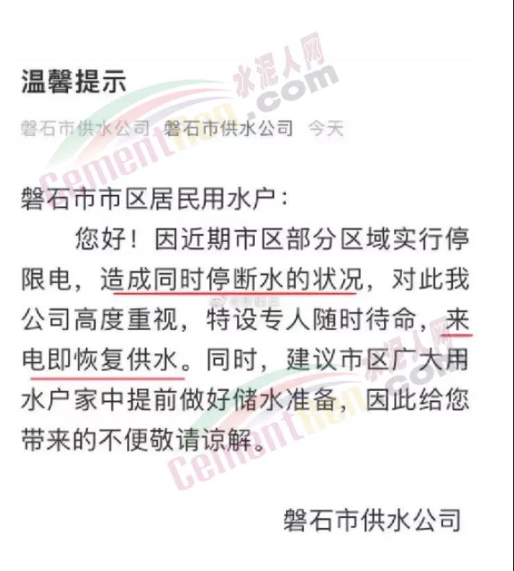無獨有偶,磐石市供水公司近期也發布了類似的通知稱,因近期市區部分區域實行停限電,造成同時停斷水的狀況,對此我公司高度重視,特設專人隨時待命,來電即恢復供水。同時,建議市區廣大用水戶家中提前做好儲水準備,因此給您帶來的不便敬請諒解。