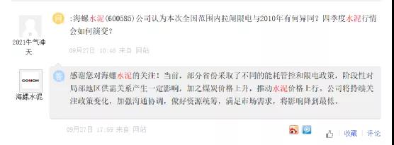 該消息一出,多位投資者在市公司平臺向海螺水泥提出相關區(qū)域的限電政策是否影響到了企業(yè)正常的生產,公司生產用煤炭是否存在供應缺口等問題。