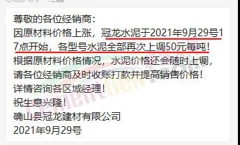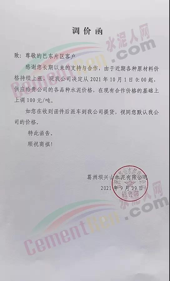 葛洲壩興山水泥有限公司通知,由于近期各種原材料價格持續(xù)上漲,現(xiàn)公司決定從2021年10月1日0∶00起,供應給貴公司的各品種水泥價格,在現(xiàn)有合作價格的基礎上上調100元/噸。
