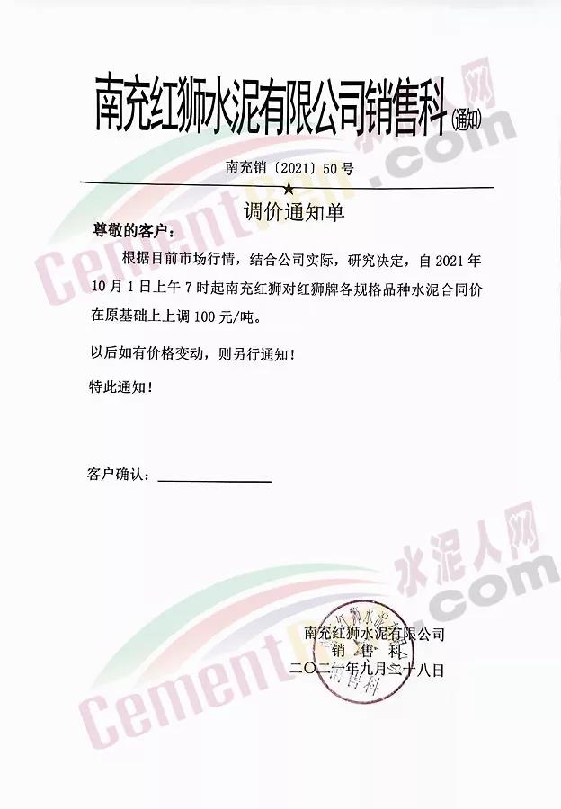 南充紅獅水泥通知,10月1日上午7時起上調各標號水泥價格100元/噸。