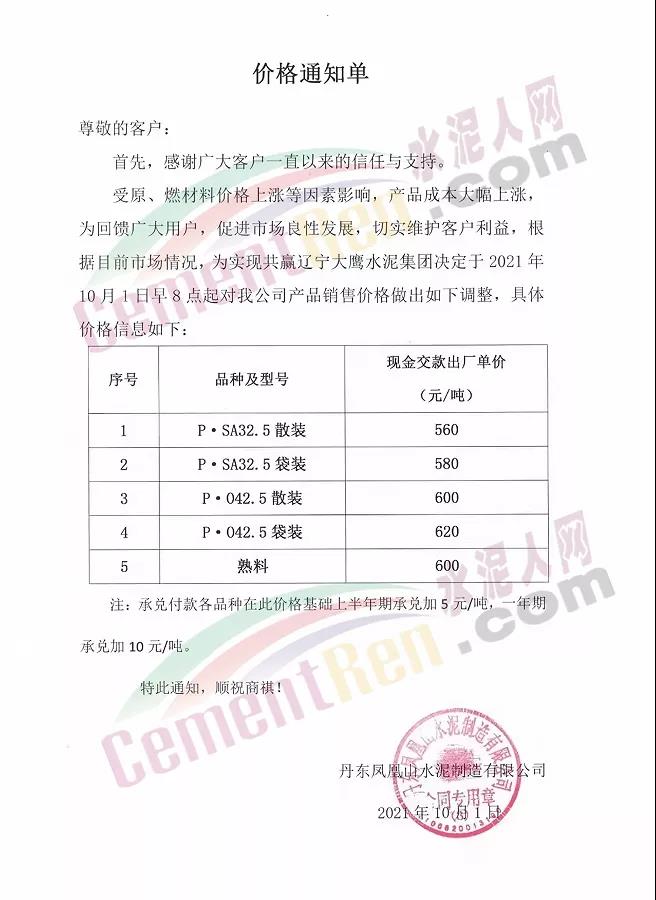 日前丹東鳳凰山水泥制造有限公司通知受原、燃材料價格上漲等因素影響,產品成本大幅上漲,為回饋廣大用戶,促進市場良性發(fā)展,切實維護客戶利益,根據(jù)目前市場情況,為實現(xiàn)共贏遼寧大鷹水泥集團決定于2021年10 月1日早8點起對公司產品銷售價格做出調整,調整后PO42.5散裝水泥和熟料報價都是600元/噸。