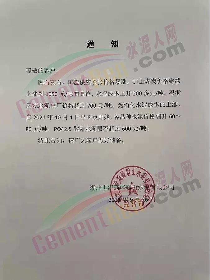 湖北世紀新峰雷山水泥有限公司通知,因石灰石、礦渣供應緊張價格暴漲,加上煤炭價格繼續(xù)上漲到1650元/噸的高位,水泥成本上升200多元/噸,粵浙區(qū)域水泥出廠價格超過700元/噸,為消化水泥成本的上漲,自2021年10月1日早8點開始,各品種水泥價格調升60~80元/噸,PO42.5散裝水泥限不超過600元/噸。