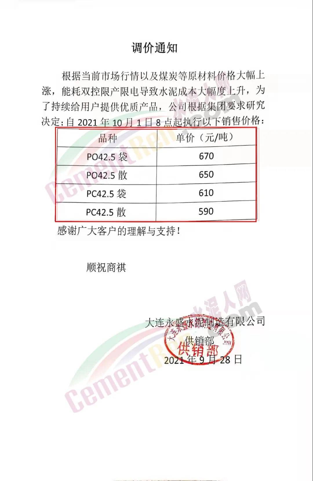 大連永盛水泥制造有限公司通知,根據(jù)當前市場行情 以及煤炭等原材料價格大幅上漲,能耗雙控限產限電導致水泥成本大幅上升,為了持續(xù)給用戶提供優(yōu)質產品,公司根據(jù)集團要求研究決定自10月1日8時起執(zhí)行最新銷售價格。其中PO42.5散裝水泥報價650元/噸,PC42.5袋裝水泥報價 610元/噸。
