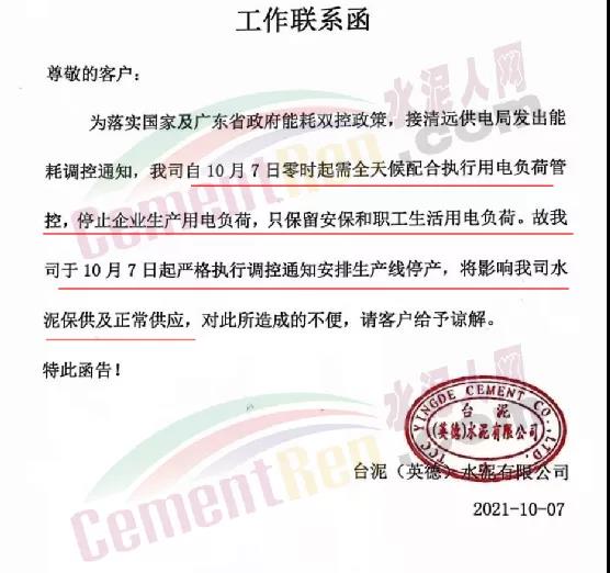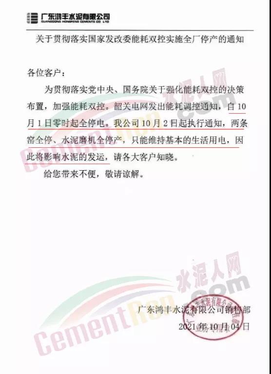 廣東鴻豐水泥有限公司通知為貫徹落實(shí)黨中央、國務(wù)院關(guān)于強(qiáng)化能耗雙控的決策布置,加強(qiáng)能耗雙控。韶關(guān)電網(wǎng)發(fā)出能耗調(diào)控通知,自10月1日零時(shí)起全停電。我公司10月2日起執(zhí)行通知,兩條窯全停、水泥磨機(jī)全停產(chǎn),只能維持基本的生活用電,因此將影響水泥的發(fā)運(yùn)。